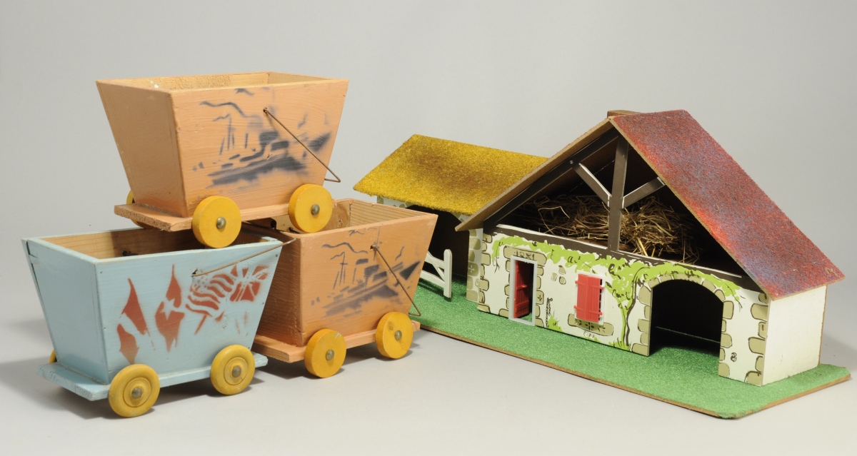 - LA HOTTE AUX JOUETS. CORPS DE FERME composé d'une étable et d'une grange en isorel, bois aggloméré et matière plastique polychromes. Dans son carton d'origine. Très bon état. Long. 63, Prof. 22 cm.