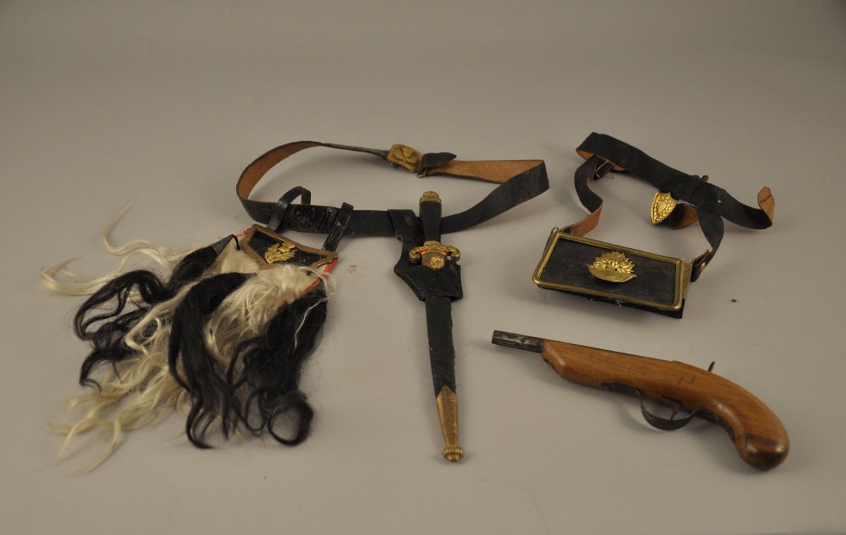 BAUDRIER en cuir et POIGNARD écossais en métal pour enfant, comprenant un écusson en crin synthétique, et décor en laiton.