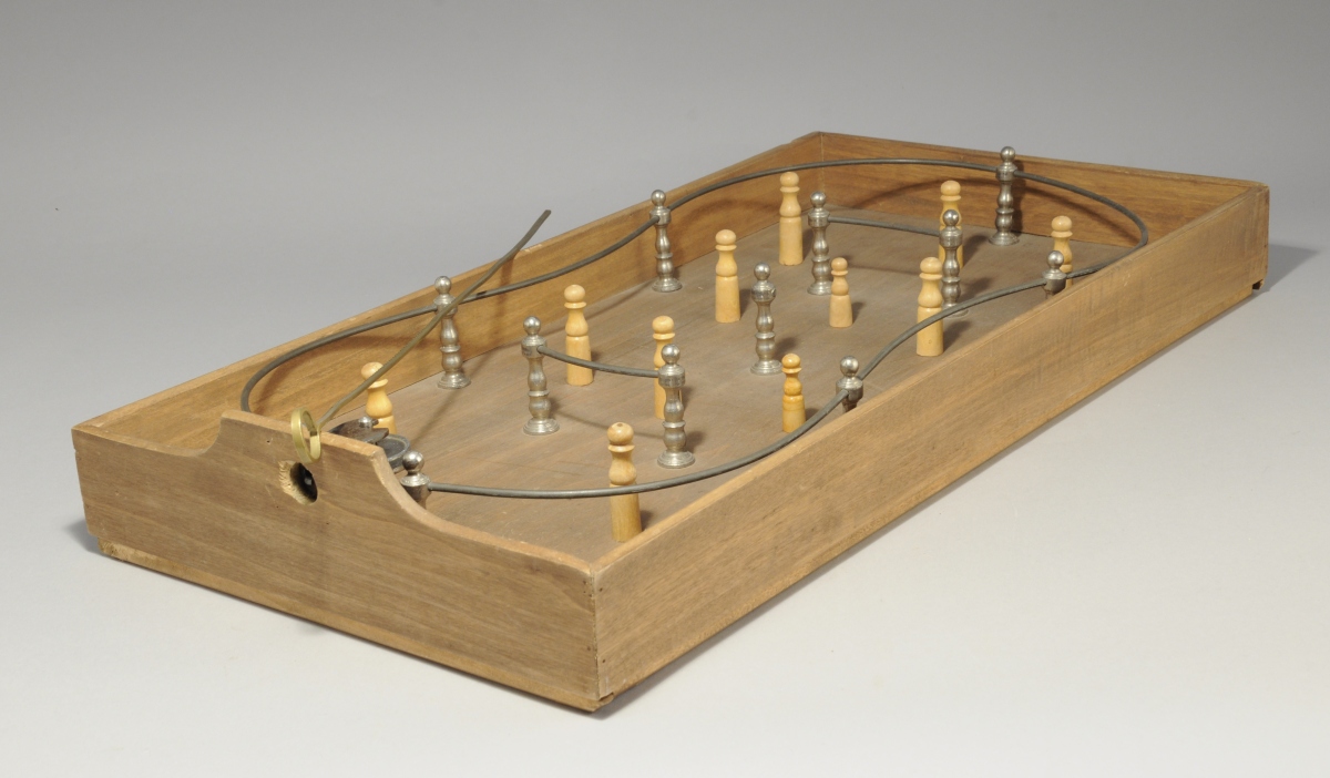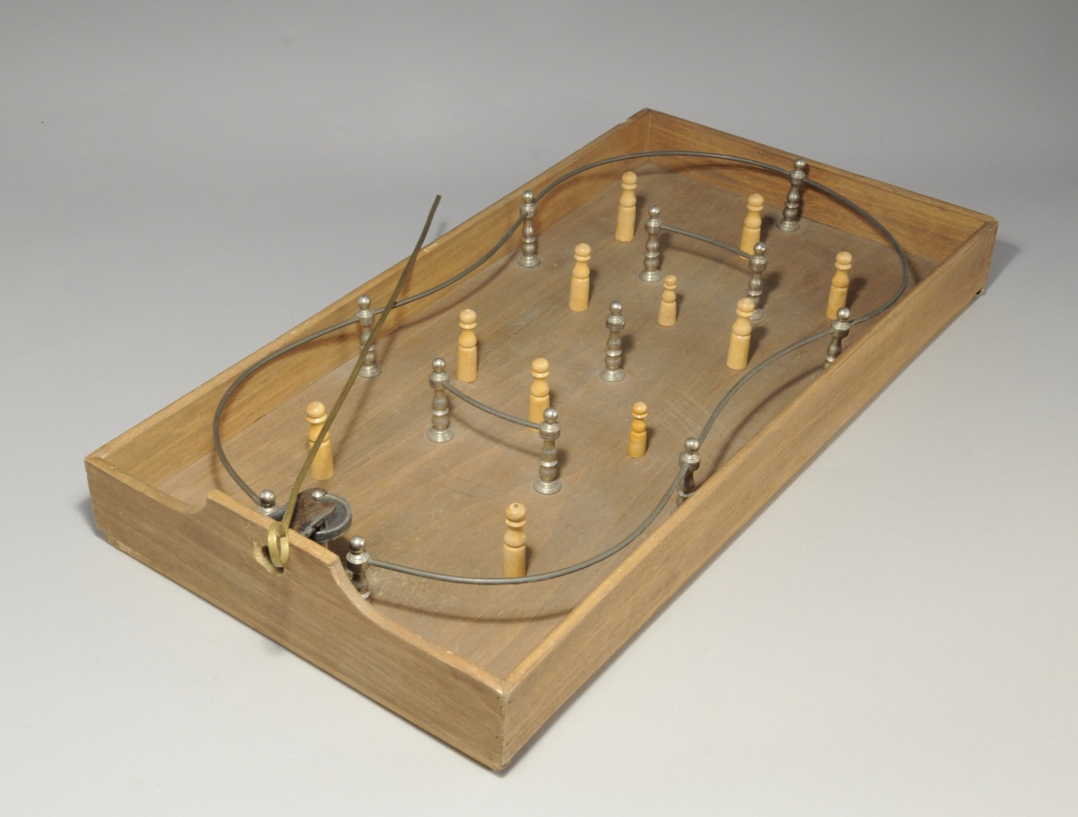 BILLARD dit aux "TOUPIES HOLLANDAISES" en bois comprenant un circuit de 12 plots en métal, une toupie, son lanceur et 11 quilles de bois.