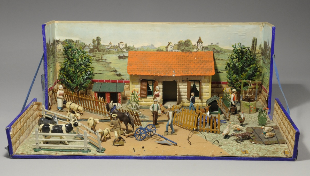 LA FERME. Boite en carton ouvrable comprenant une cour de ferme dans un décor chromolithographié de fleuves et paysage comprenant des éléments en aluminium peint (ferme, clapier à lapins, niche, puits, charrue, 9 barrières, 2 arbres, marre, fleurs) et d'autres en plomb peint (7 personnages tels fermiers, fermières et enfants, 21 animaux tels cheval, vaches, âne, moutons, lapins, poules, chiens, canards, dindon, pigeon).