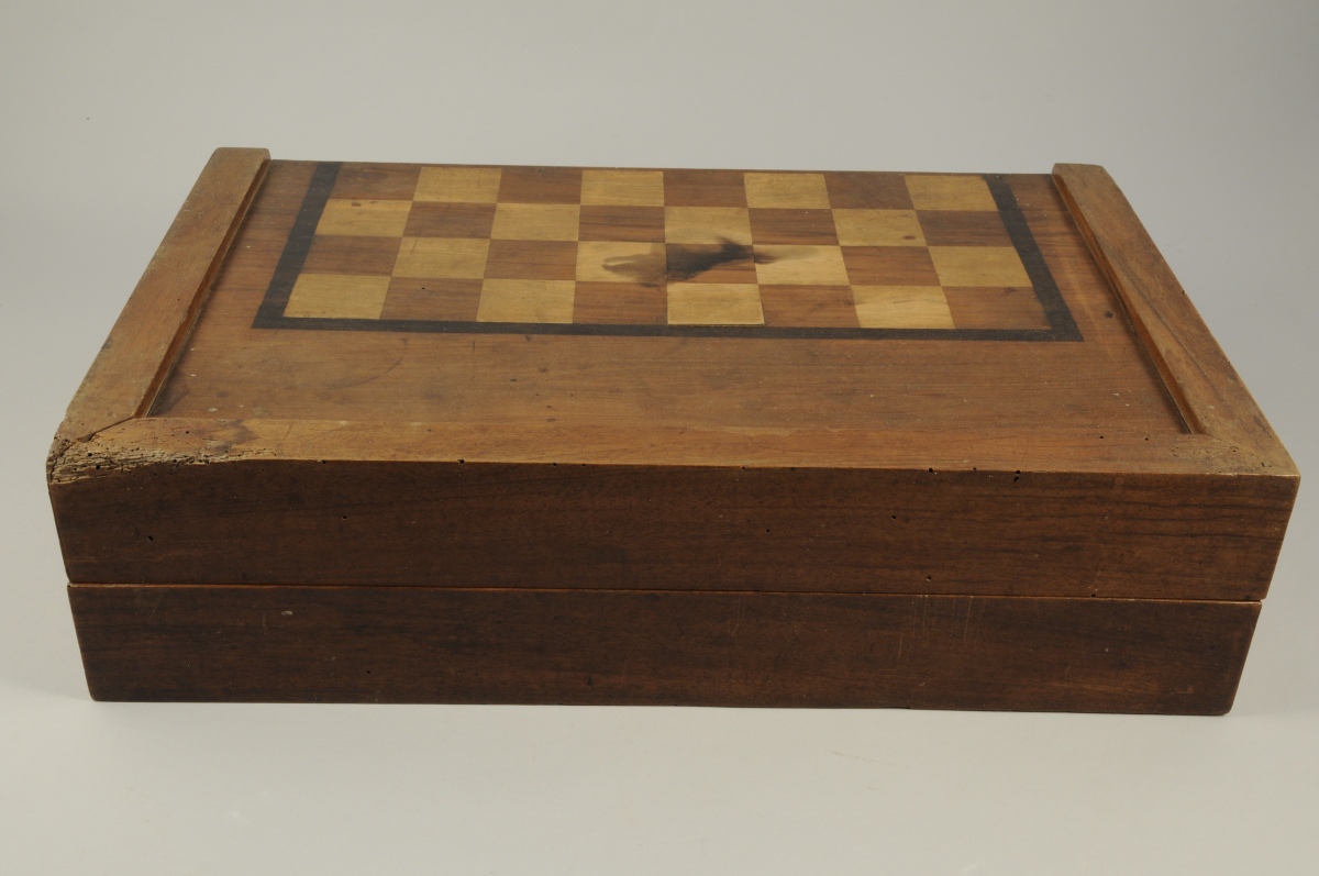 COFFRET À JEU de forme rectangulaire en noyer. Déplié, le parties supérieures marquetées d'un damier formant plateau de jeu. L'intérieur acceuille un jeu de tric-trac. Avec boîte de dominos en os, quatre gobelets en cuir, des palets de dames en bois, des dés et des jetons en os.