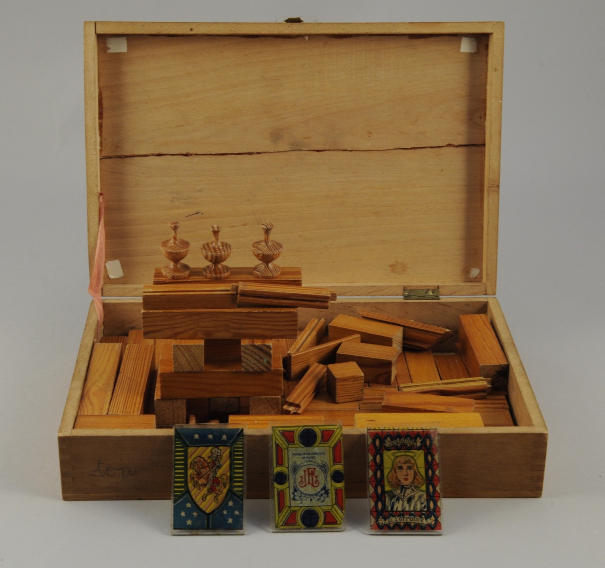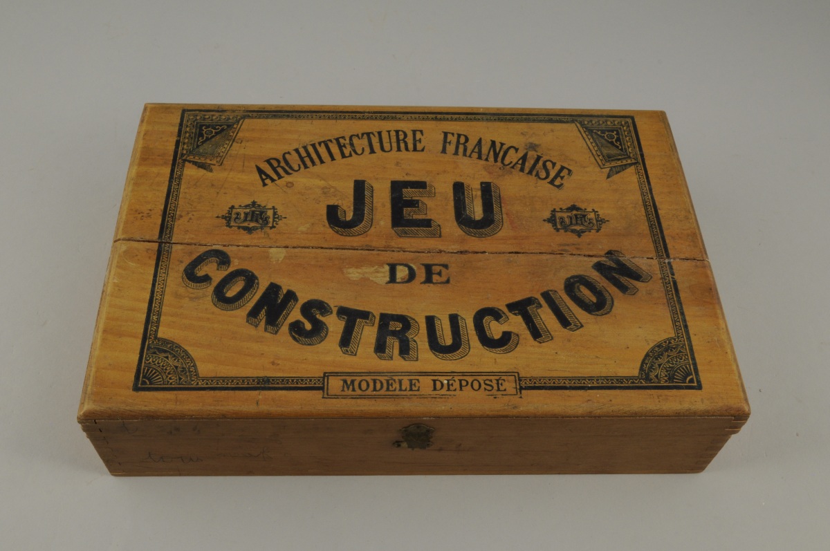 LES JEUX ET JOUETS FRANCAIS. JEU de Construction Architecture Française comprenant différentes pièces de construction en bois, 3 vitraux en papier coloré fixé sous verre. Dans une boîte en bois.