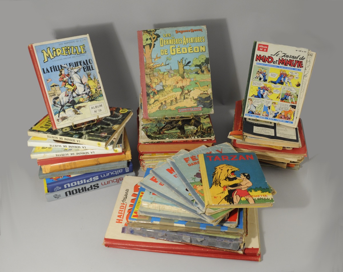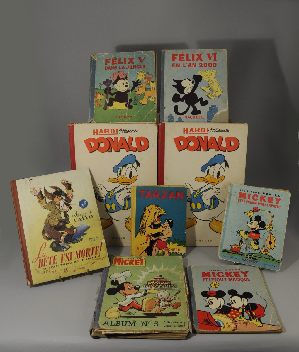 LIVRES JEUNESSE ET BANDES-DESSINÉES, IMPORTANT ENSEMBLE, 60 PIÈCES environ, dont: La Bête est Morte (2e fascicule), Albums Mickey (11 et 12), Journal de Mickey (61, 73, 105 à 130, 324 à 341), Mickey et le prince Malalapatte, Félix (5 et 6), Donald (266 à 284 et 290 à 299), Journal de Spirou, Tintin, Le Rayon du Mystère, Les Malheurs de Sophie, Tarzan, Images du Far-West, Histoire de l'Armée Française, Âmes Vaillantes, la Semaine de Suzette, éditions MAME, Nathan, Benjamin Rabier, Atlas géographique, 22 reproductions militaires...etc.