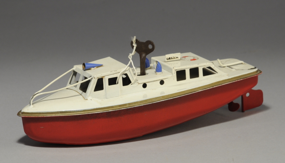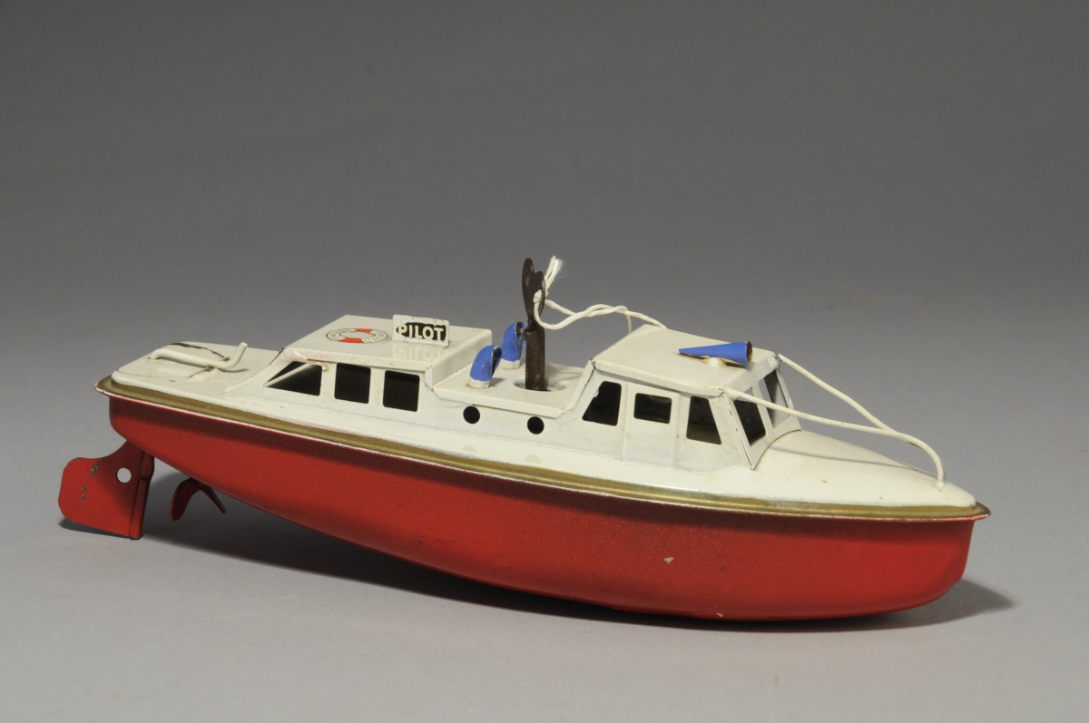 SUTCLIFF. CANOT MOTEUR "PILOT" en tôle polychrome à remontage mécanique.
