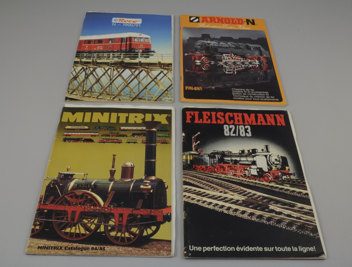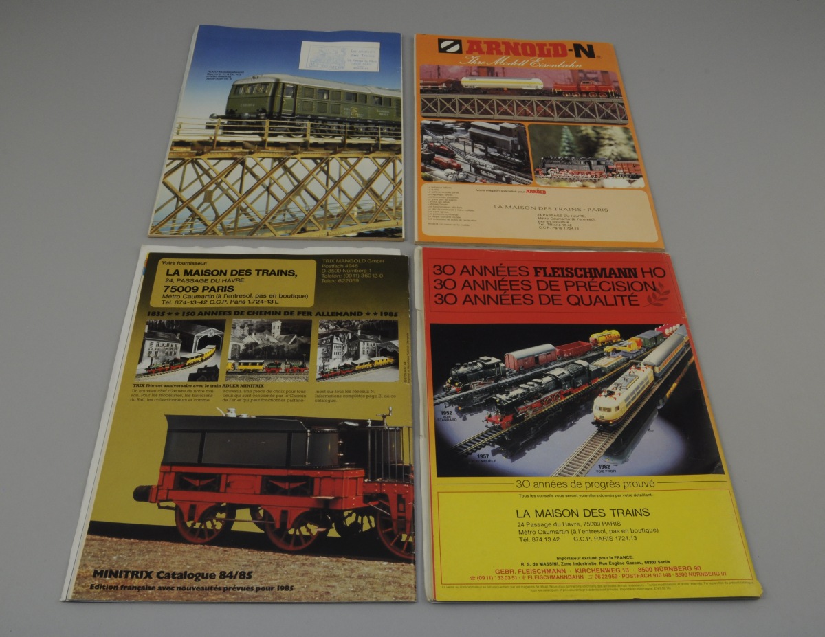 LOT de QUATRE CATALOGUES de trains électriques: FLEISCHMANN 82/83, MINITRIX 84/85, ARNOLD 84/85 et ROCO 90/91.