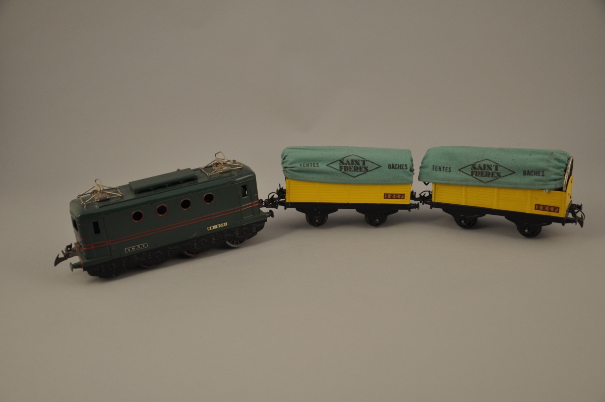 MECCANO. Trains HORNBY, 5 PIÈCES: LOCOMOTIVE, 3 WAGONS de fret (Saint Frères, Stef réfrigérant) et un PASSAGE À NIVEAU.