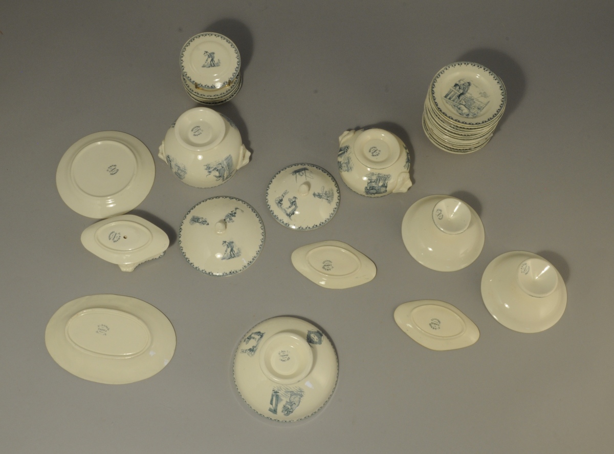 SAINT-AMAND. DINETTE DE POUPÉE en faïence de 34 pièces à décors imprimé des jeux de l'enfance comprenant: 12 assiettes plates, 6 assiettes creuses, 6 petites assiettes, 1 légumier, 2 compotiers, 2 petits plats ovales, 1 grand plat ovale, 1 plat rond, 1 petite soupière, 1 grande soupière et 1 saucière.
