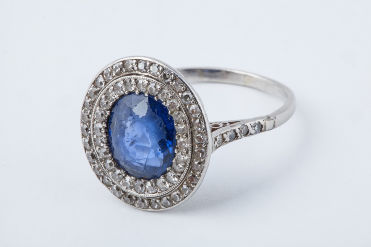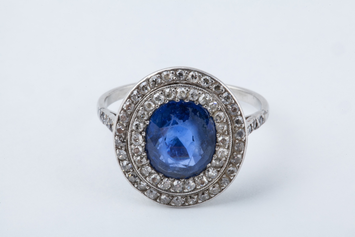 BAGUE en or blanc sertie d'un saphir bleu de taille ovale, dans un double entourage de petits brillants. Monture ajourée de feuillages et fleurs.
