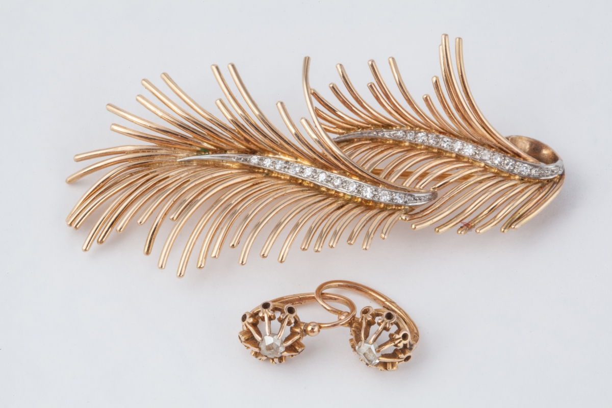 BROCHE DOUBLE PALMES en or jaune pavée de DIAMANTS.