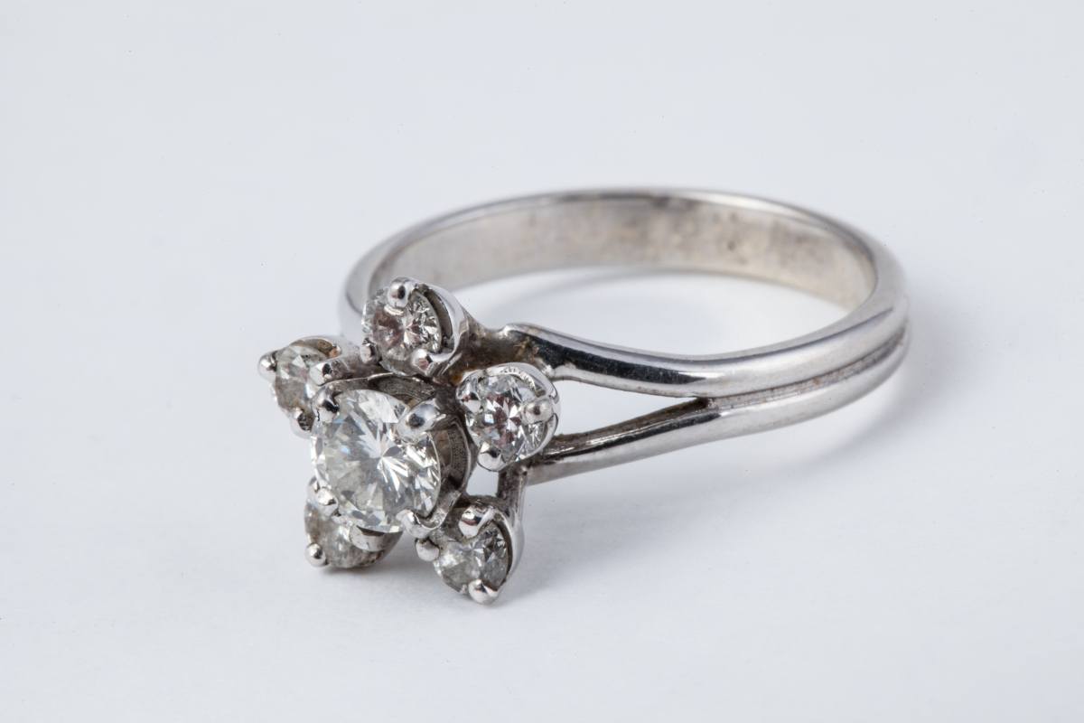 BAGUE "fleur" en or gris 18K ornée de six DIAMANTS ronds de taille brillant, celui du centre plus important.