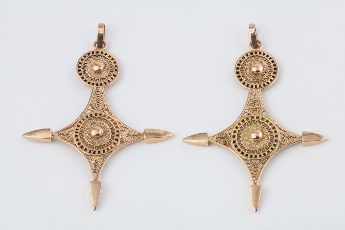 PAIRE DE PENDENTIFS CROIX DU SUD en or jaune réticulé.Haut....