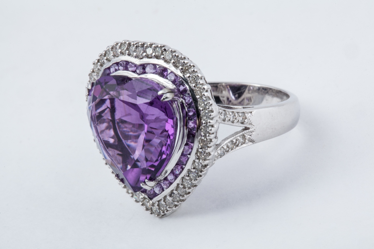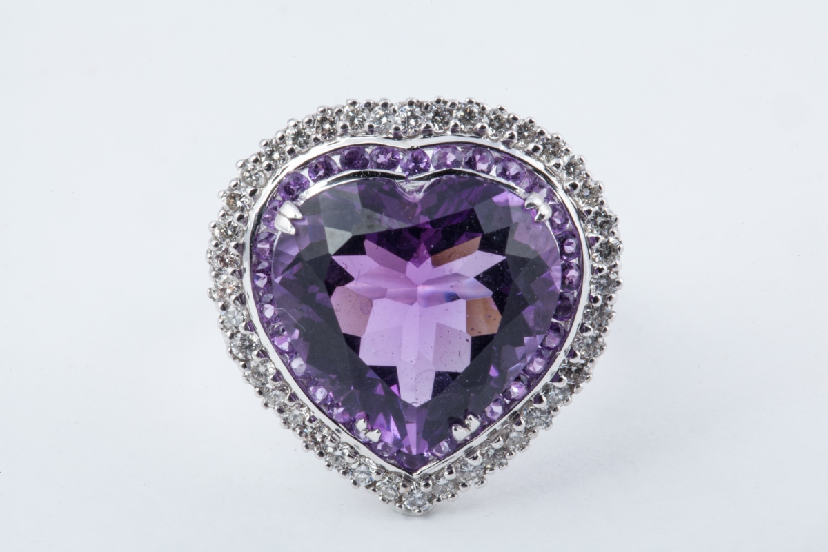 BAGUE COEUR en or blanc, ornée d'une améthyste taille coeur dans un entourage de 31 améthystes rondes d'environ 9,05 carats, entourées de 40 diamants blancs taille moderne d'environ 0,65 carat.