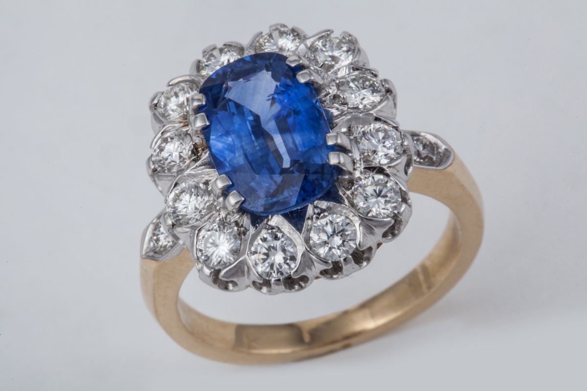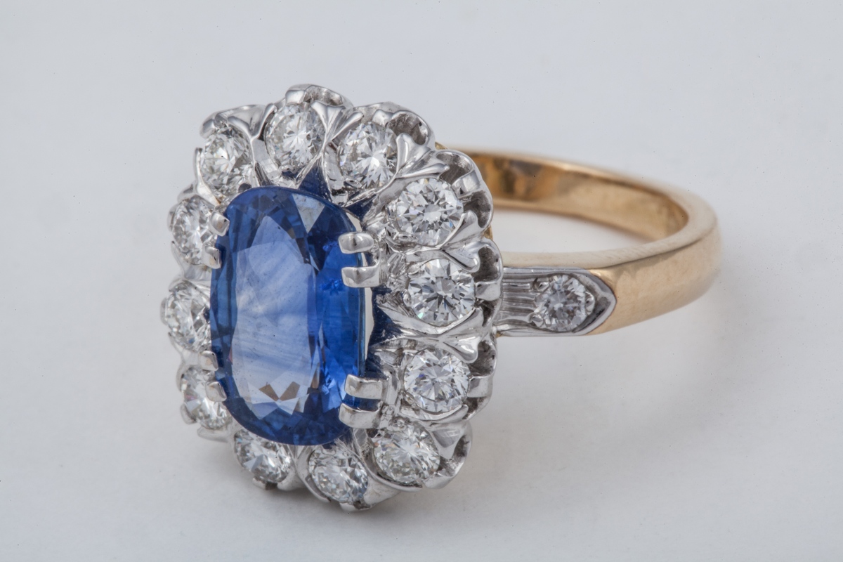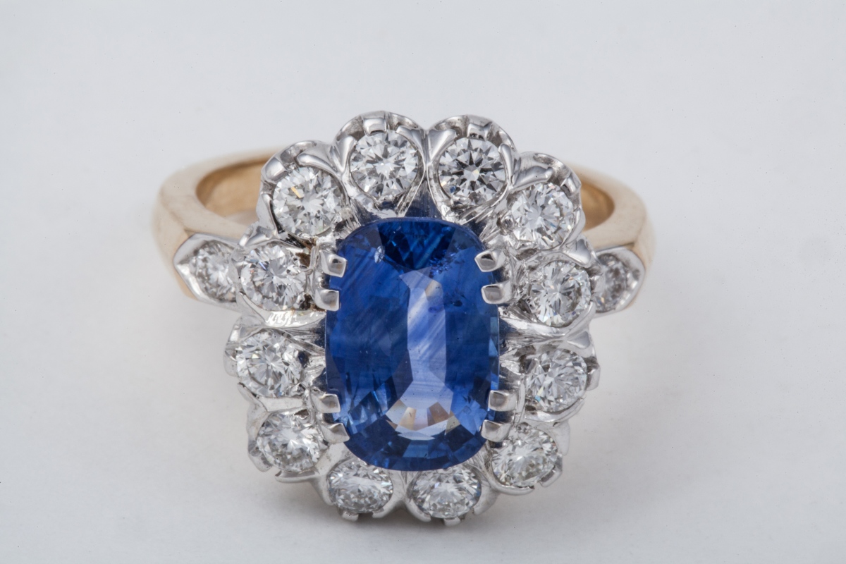 BAGUE COUSSIN en or de deux tons, ornée d'un SAPHIR taille coussin d'environ 3,05 carats, agrémenté de 12 + 2 diamants blancs taille moderne d'environ 1,10 carats.