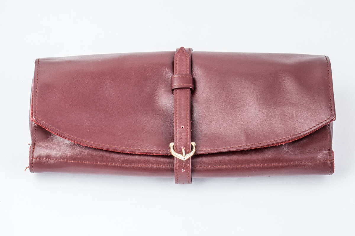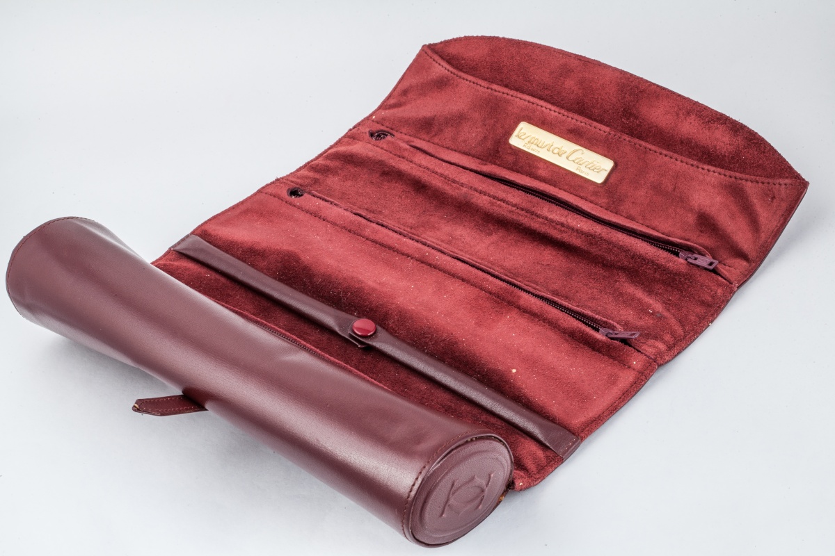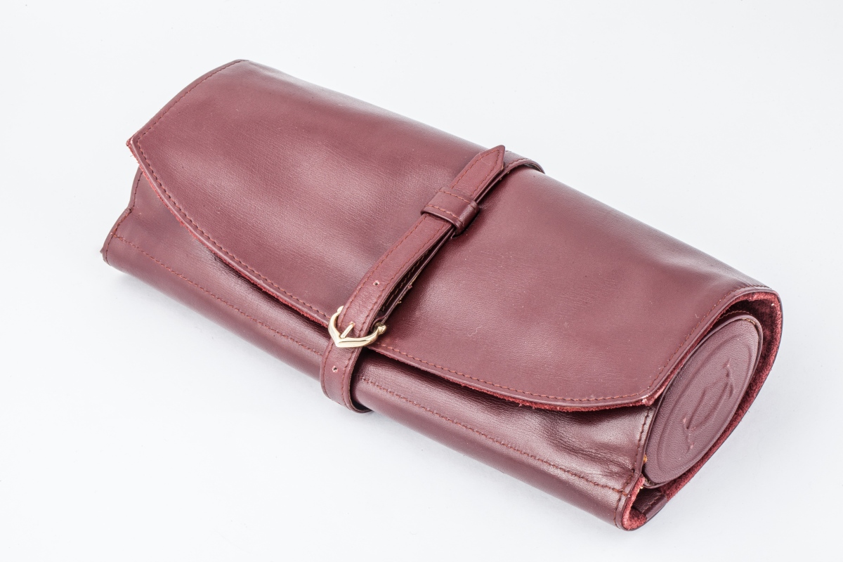 CARTIER. TROUSSE À BIJOUX DE VOYAGE en cuir souple de couleur bordeau siglée, "Les must de Cartier".