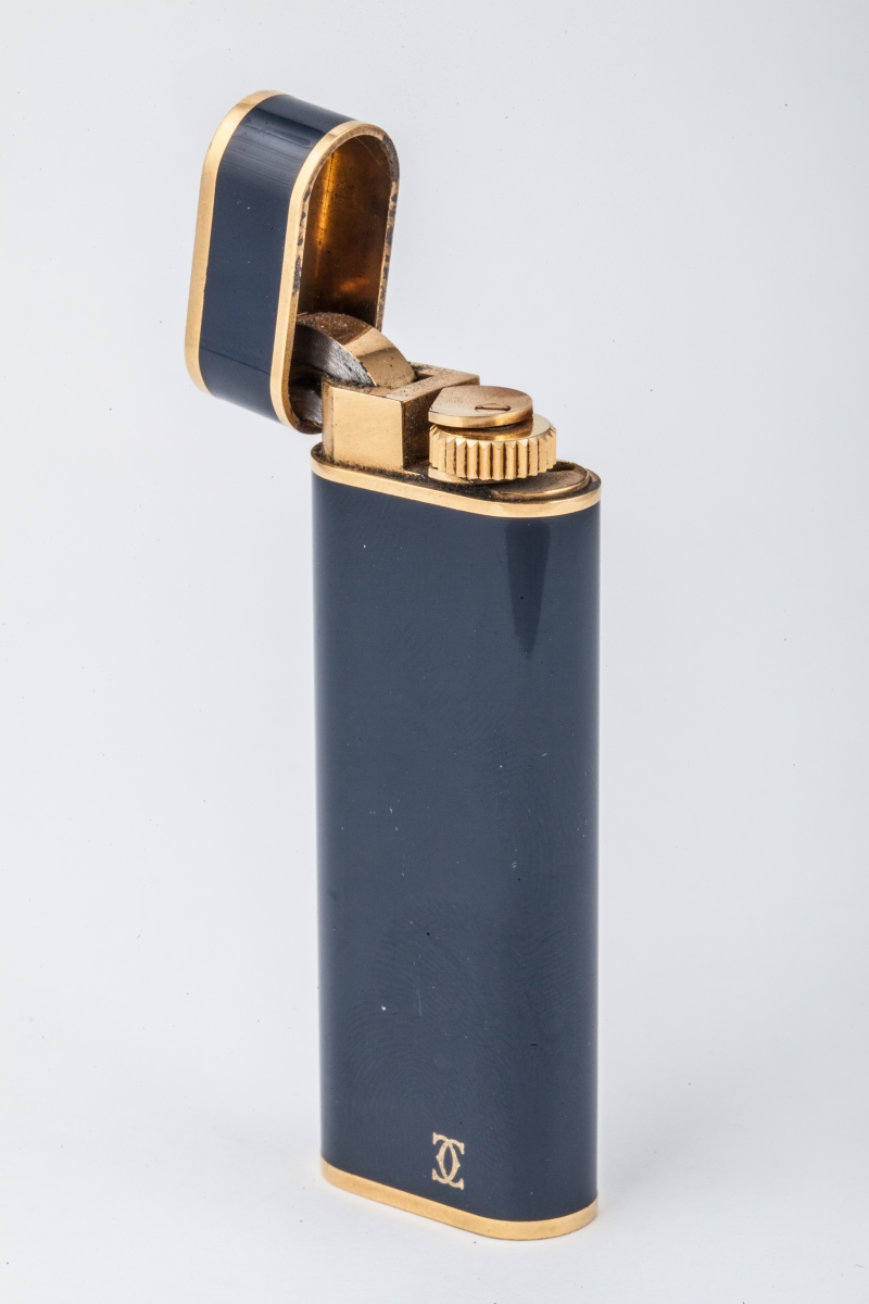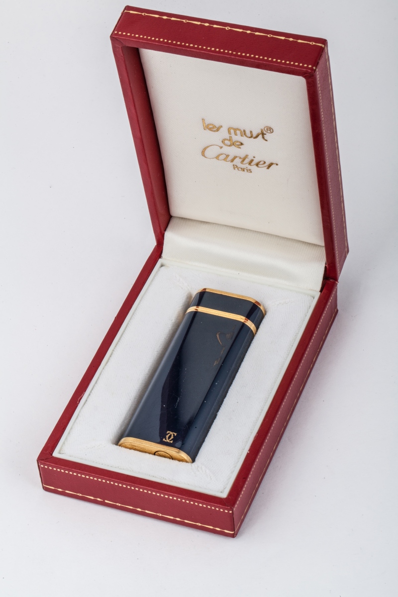 CARTIER. BRIQUET laqué bleu monogramé CC et plaqué or. Numéroté 40672J. Dans son écrin.