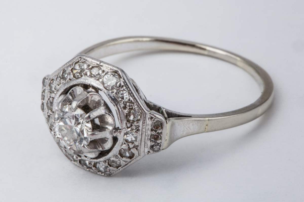 BAGUE en or gris 18K de forme géométrique ornée de DIAMANTS ronds taillés en huit huit, celui du centre plus important de taille brillant. (Marque de mise à grandeur).