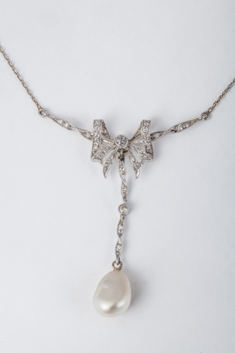 COLLIER NOEUD en platine et diamant. Une parle baroque en...