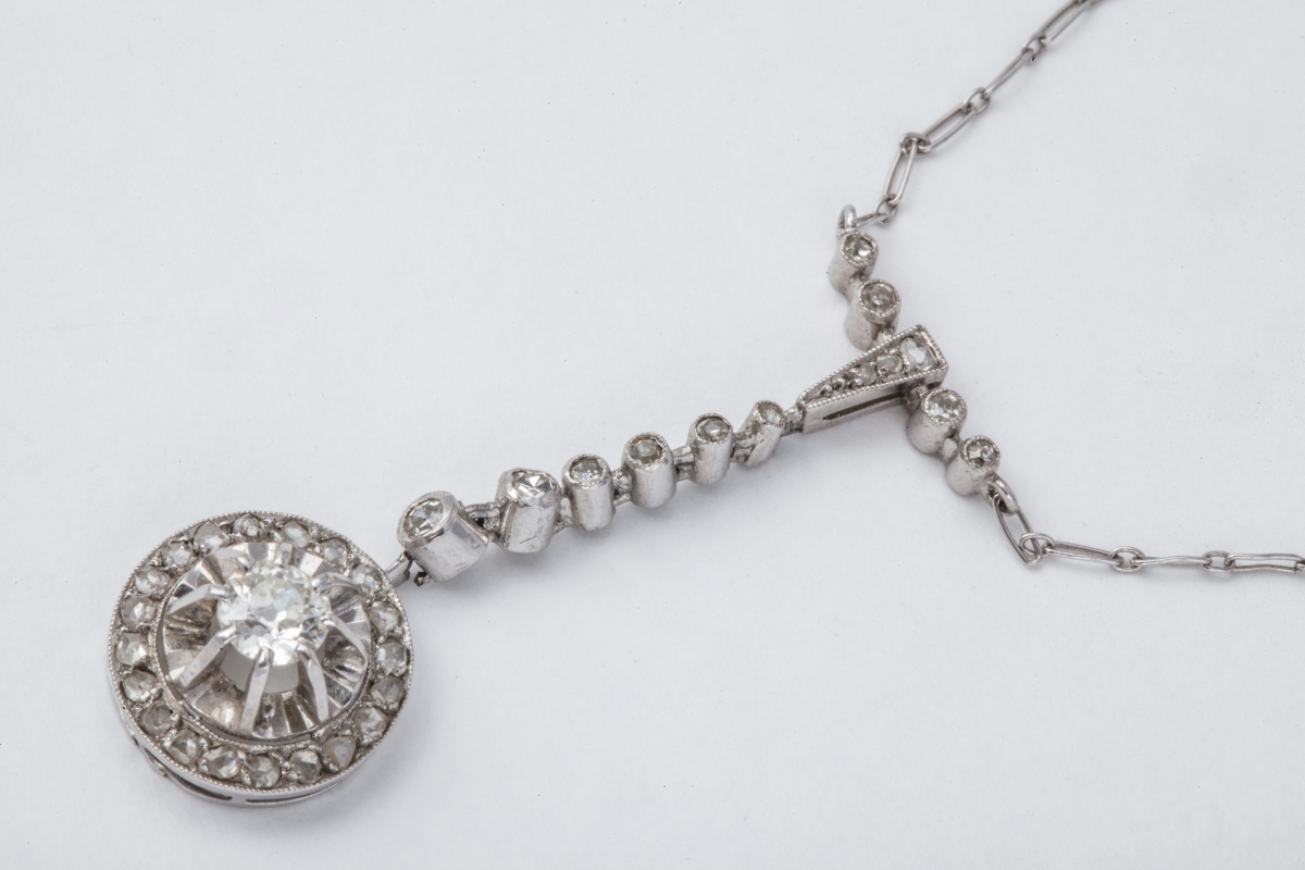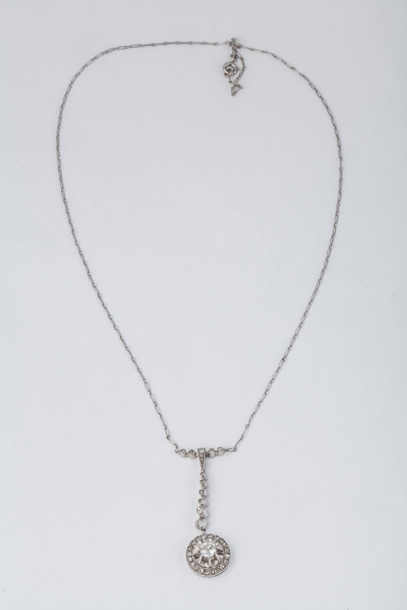 COLLIER en platine et diamant composé d'un diamant principal en chute (taille ancienne) retenu par une ligne de six petits brillants sur une baguette de quatre brillant entourant une beliaire triangulaire.