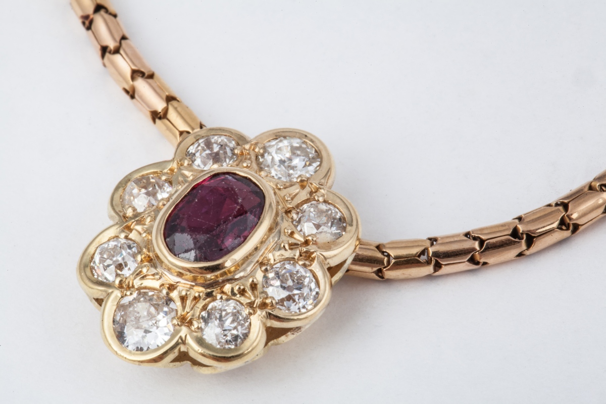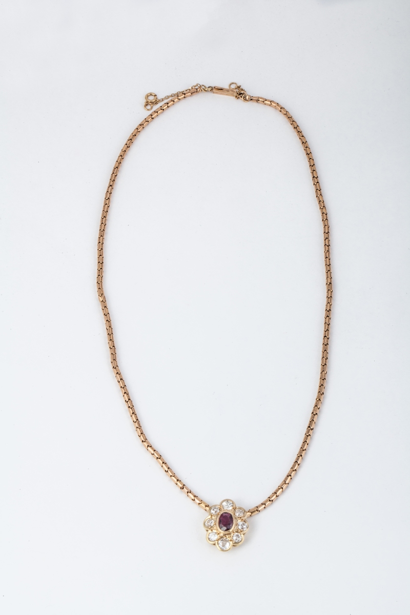 PENDENTIF en or jaune serti d'un SAPHIR (?) dans un entourage de 8 DIAMANTS tailles anciennes.
