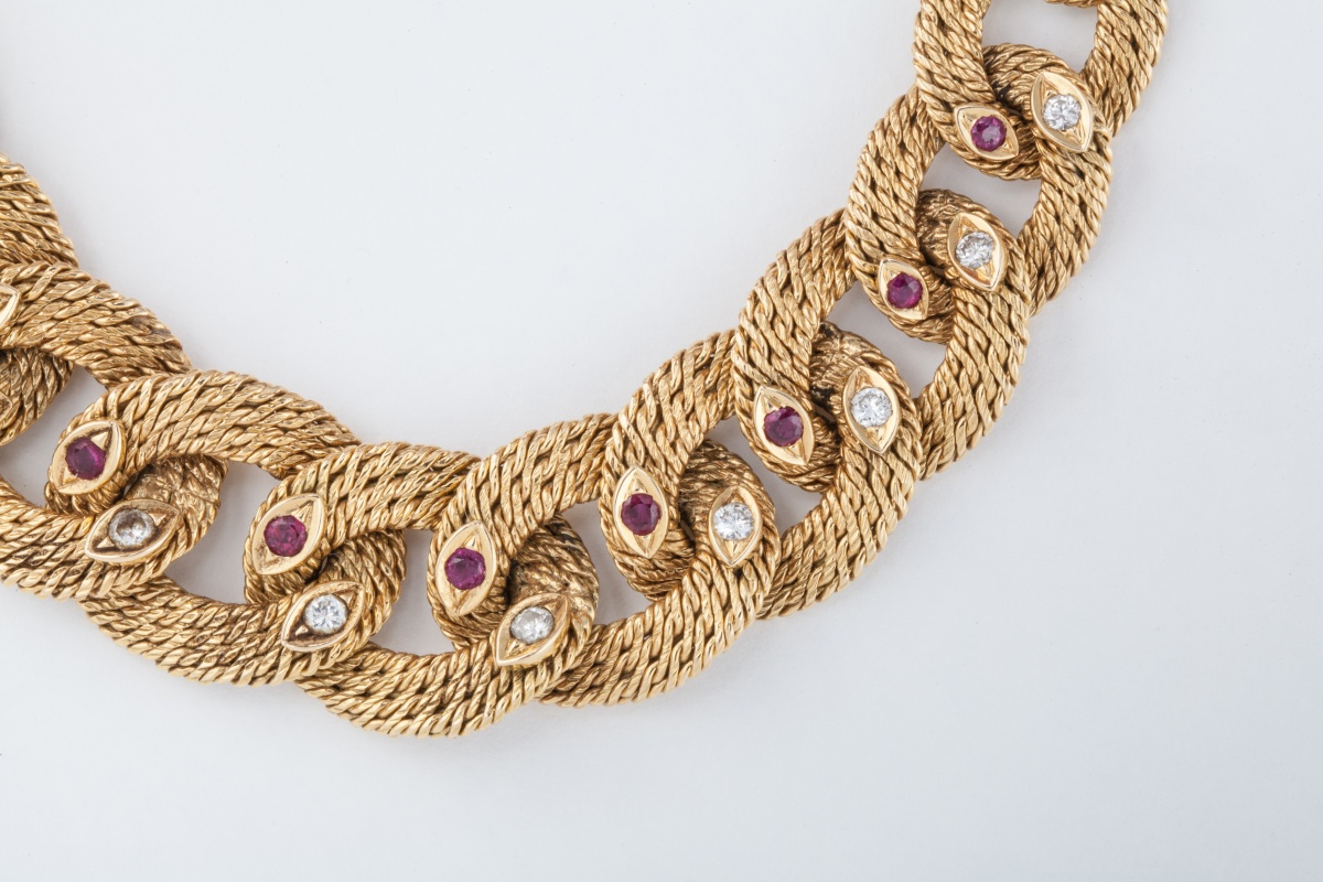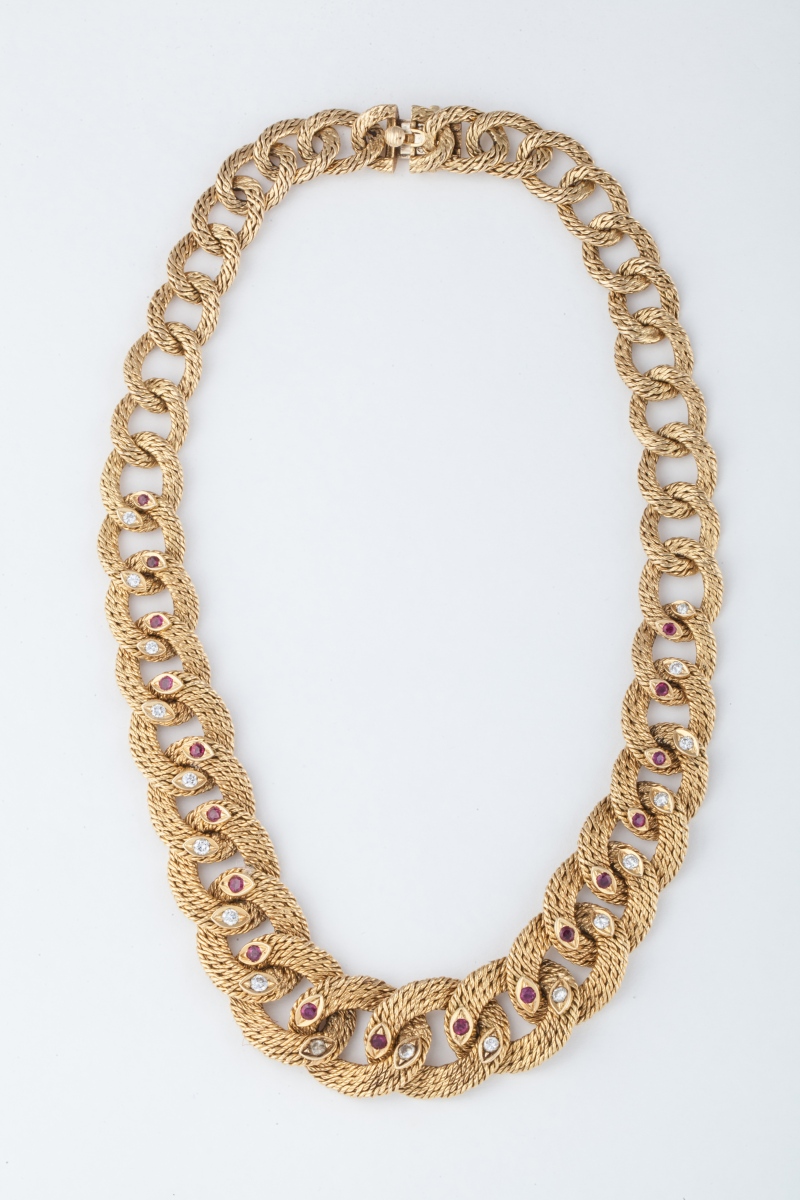 COLLIER articulé en or jaune 18K (750 millièmes), les maillons ovales entrelacés à décor de torsade en chute, partiellement serti au centre de saphirs et rubis.