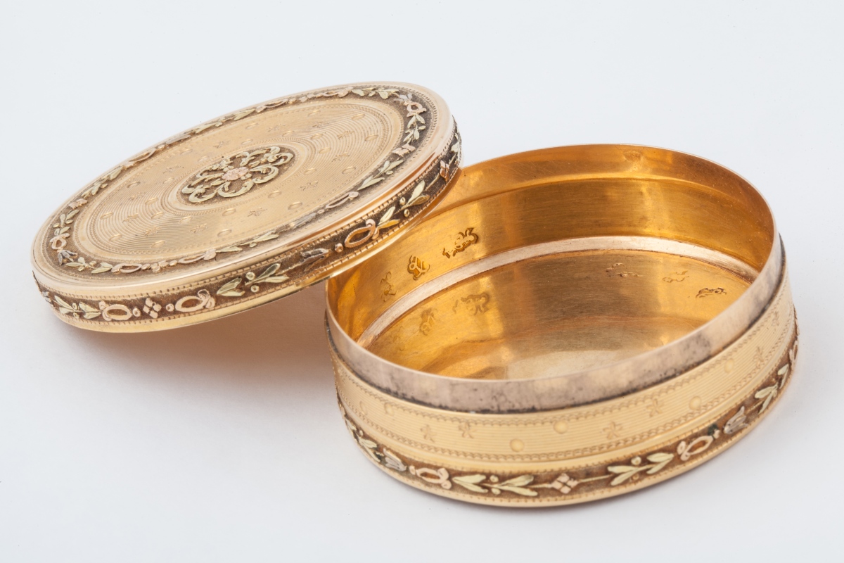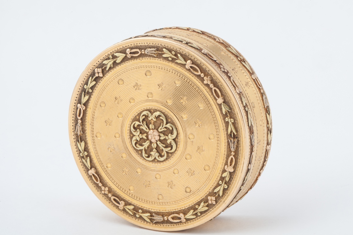 BOITE ronde en or jaune 18K (750 millièmes) gravé de filets, étoiles et perles dans des encadrements de guirlandes de fleurs.