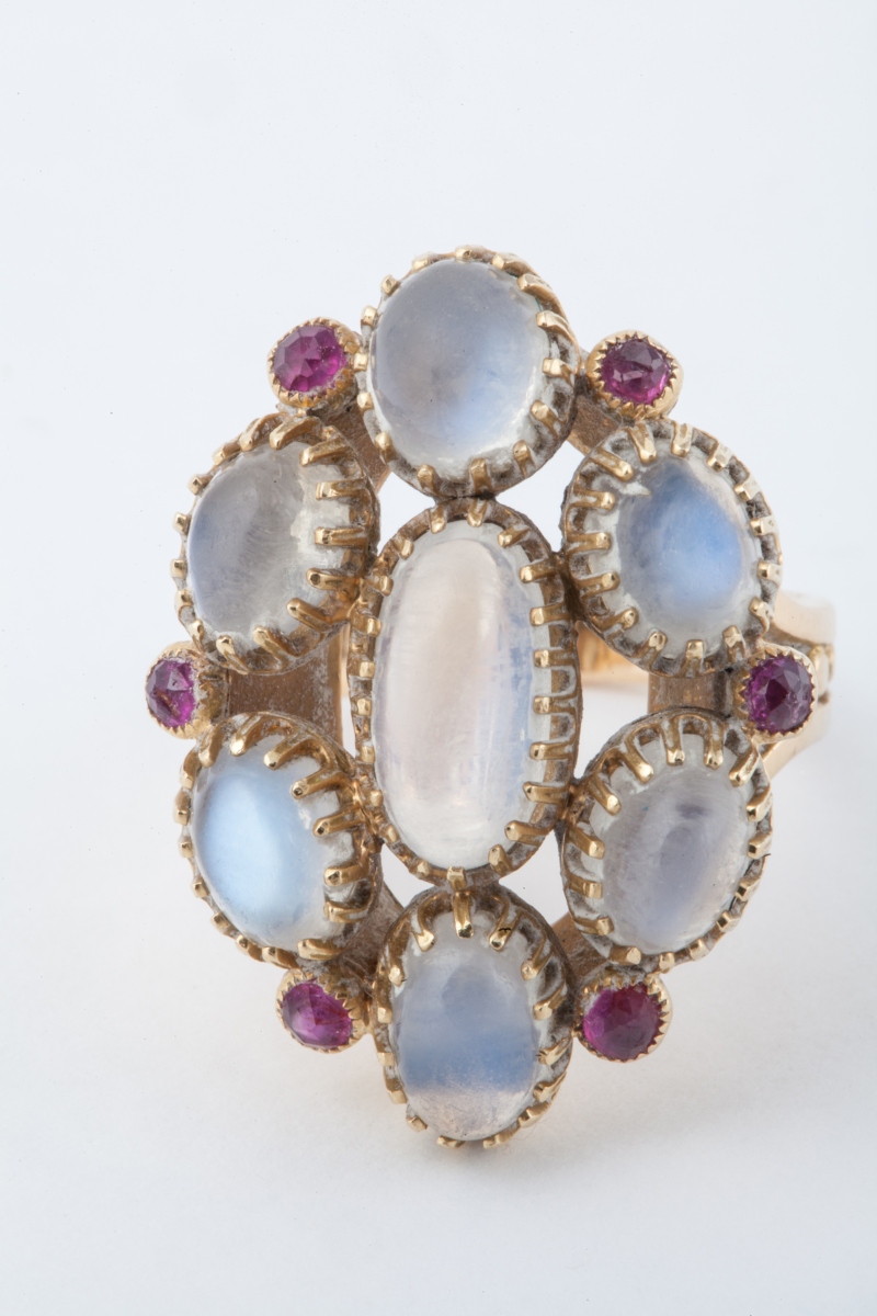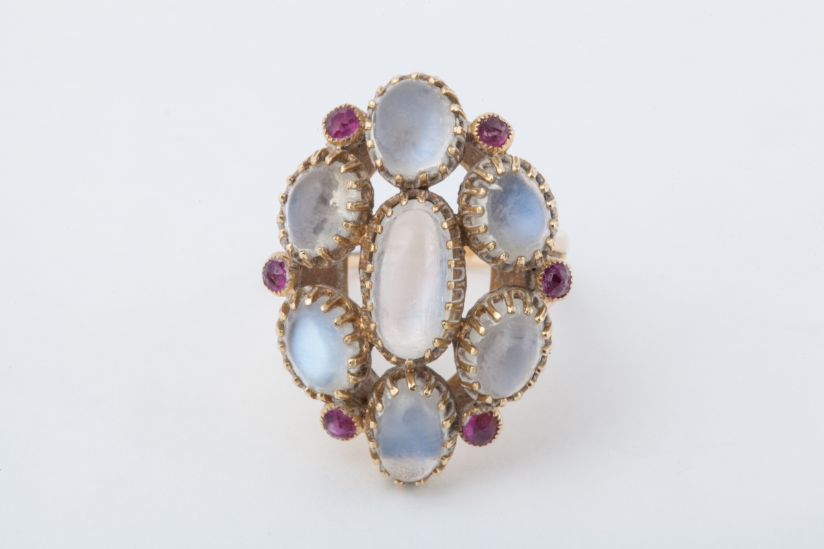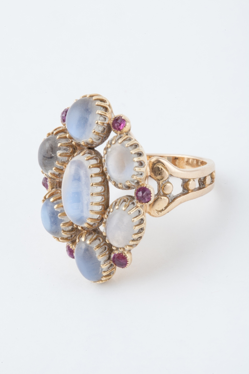 BAGUE en or jaune 18K (750 millièmes), ornée de sept pierres de lune de forme cabochon, celle du centre plus importante.