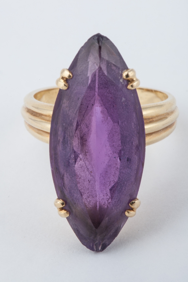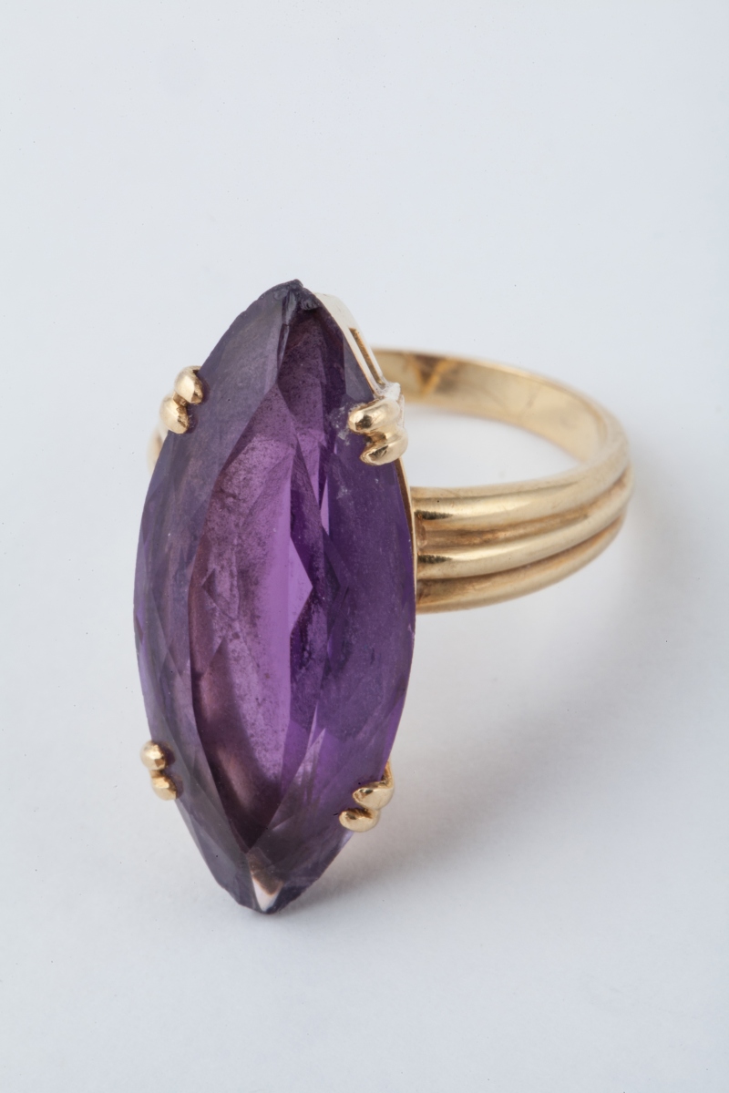 BAGUE en or jaune 18K (750 millièmes), ornée au centre d'une améthyste de forme marquise.