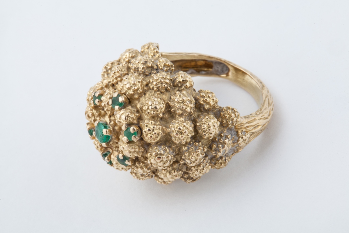 BAGUE BOULE en or jaune 18K (750 millièmes) gravé, ornée de petites émeraudes, celle du centre plus importante.