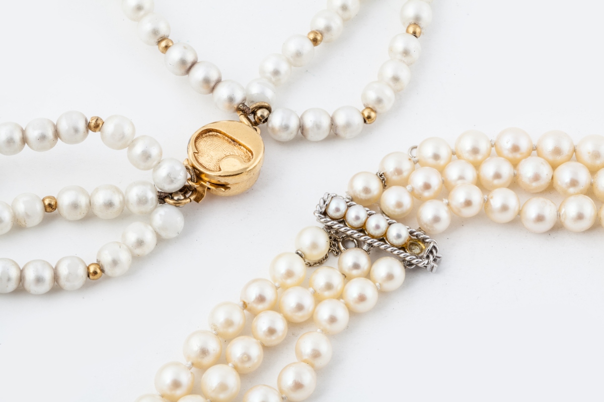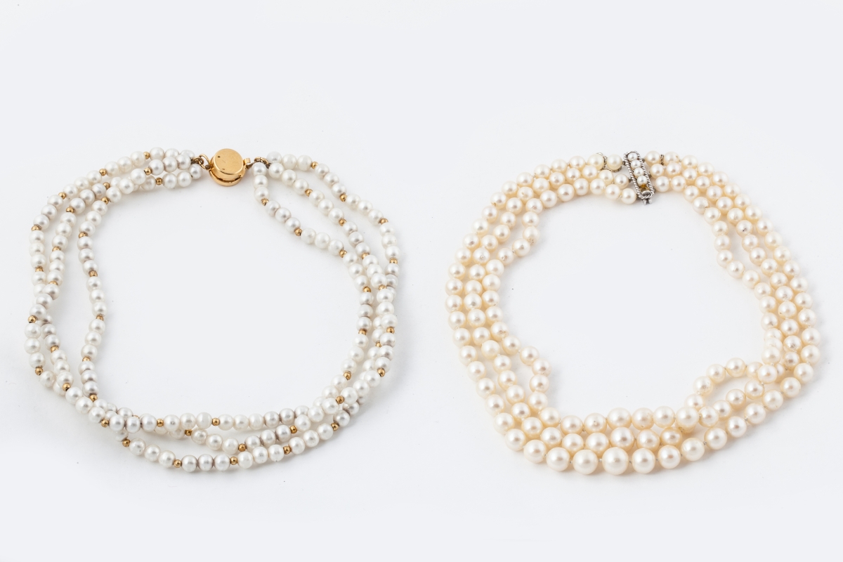COLLIER trois rangs de quarante-neuf, cinquante-trois et cinquante-trois perles de culture en chute, le fermoir en or gris 18K (750 millièmes) orné d'une ligne de petites perles de culture (manque une).