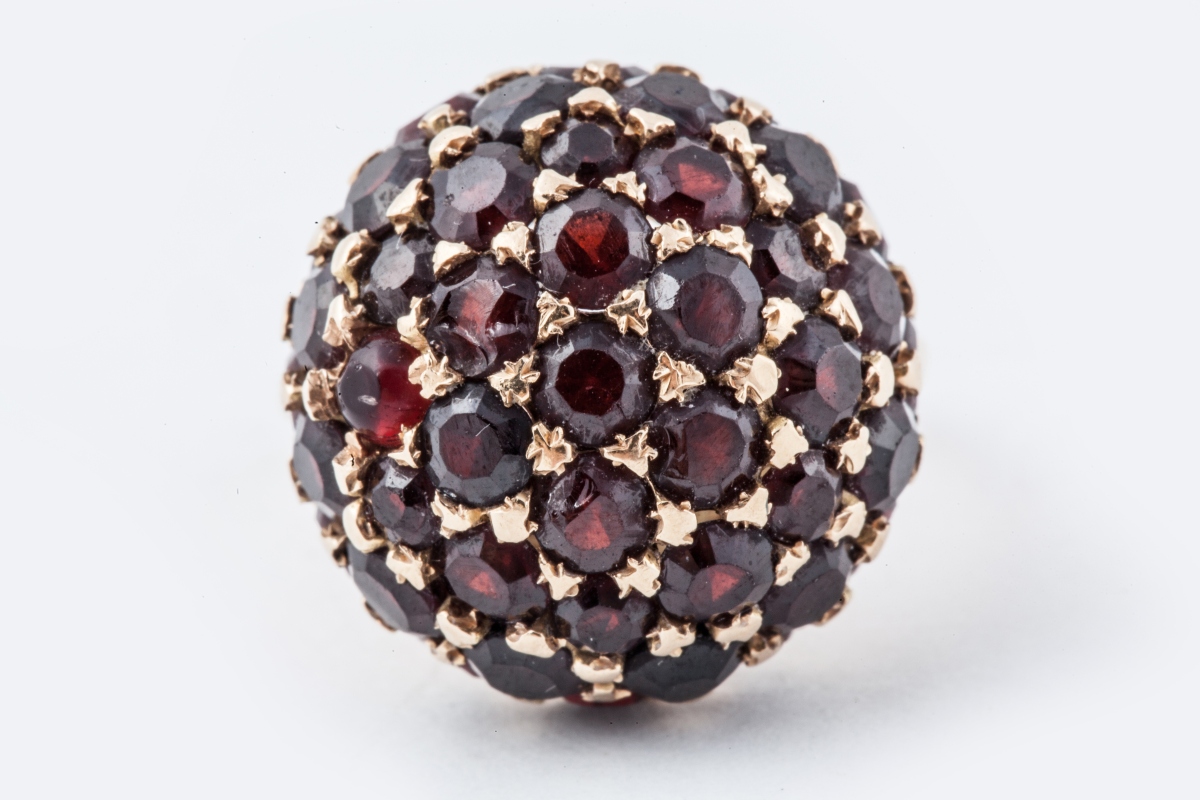 BAGUE BOULE en or jaune 18K (750 millièmes), ornée d'un pavage de petits grenats ronds.