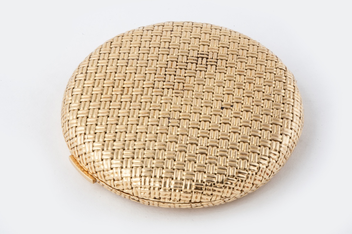 VAN CLEEF AND ARPELS. POUDRIER en or jaune de forme circulaire à motif de vannerie. Signé et numéro 101714.