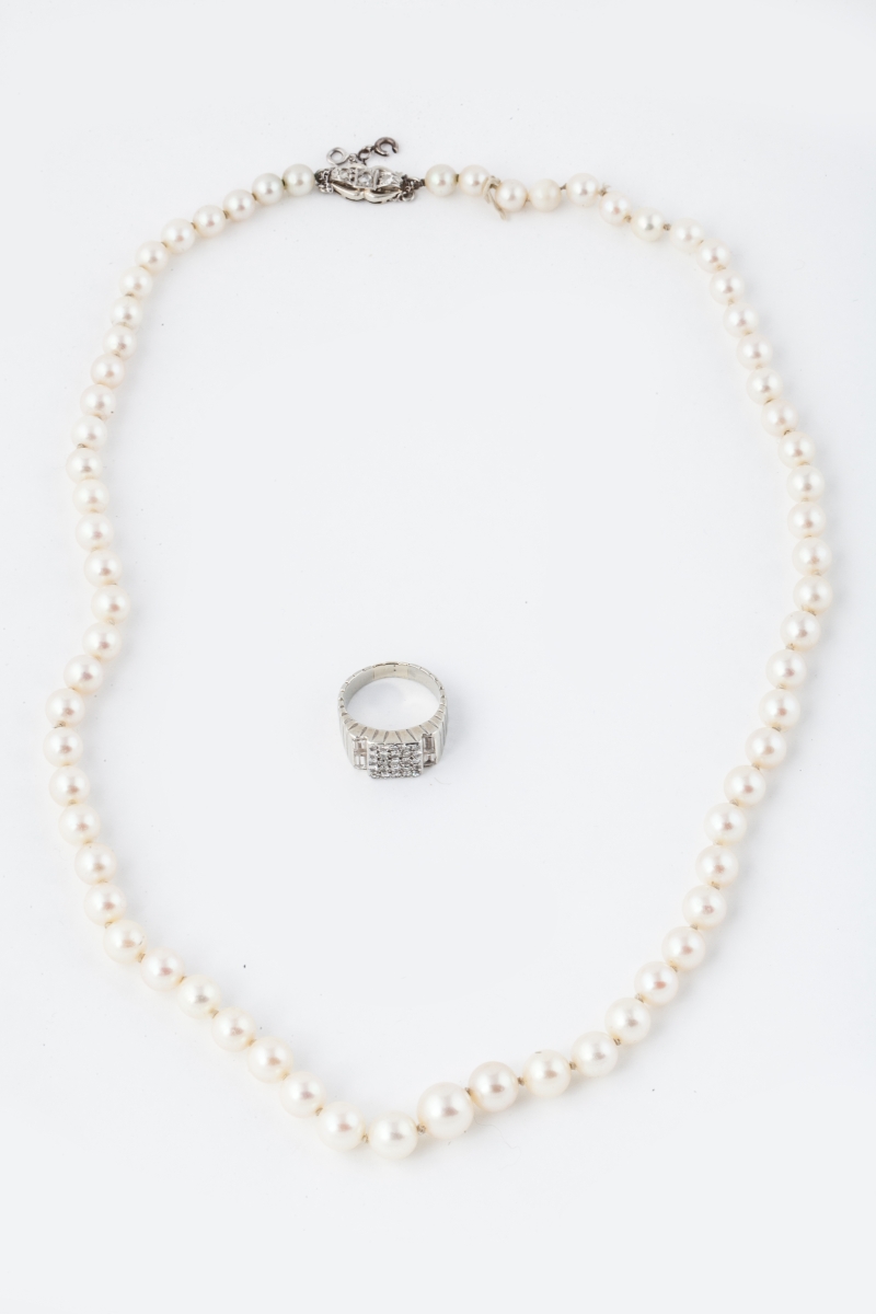Joint: COLLIER à un rang de perles, fermoire en platine et brillant. La plus grosse perle 2,4 grains. Long. 50 cm. Poids brut 32,5 g.