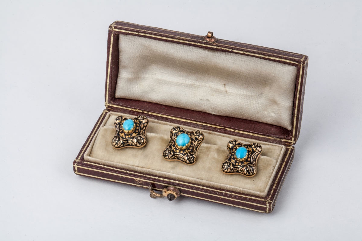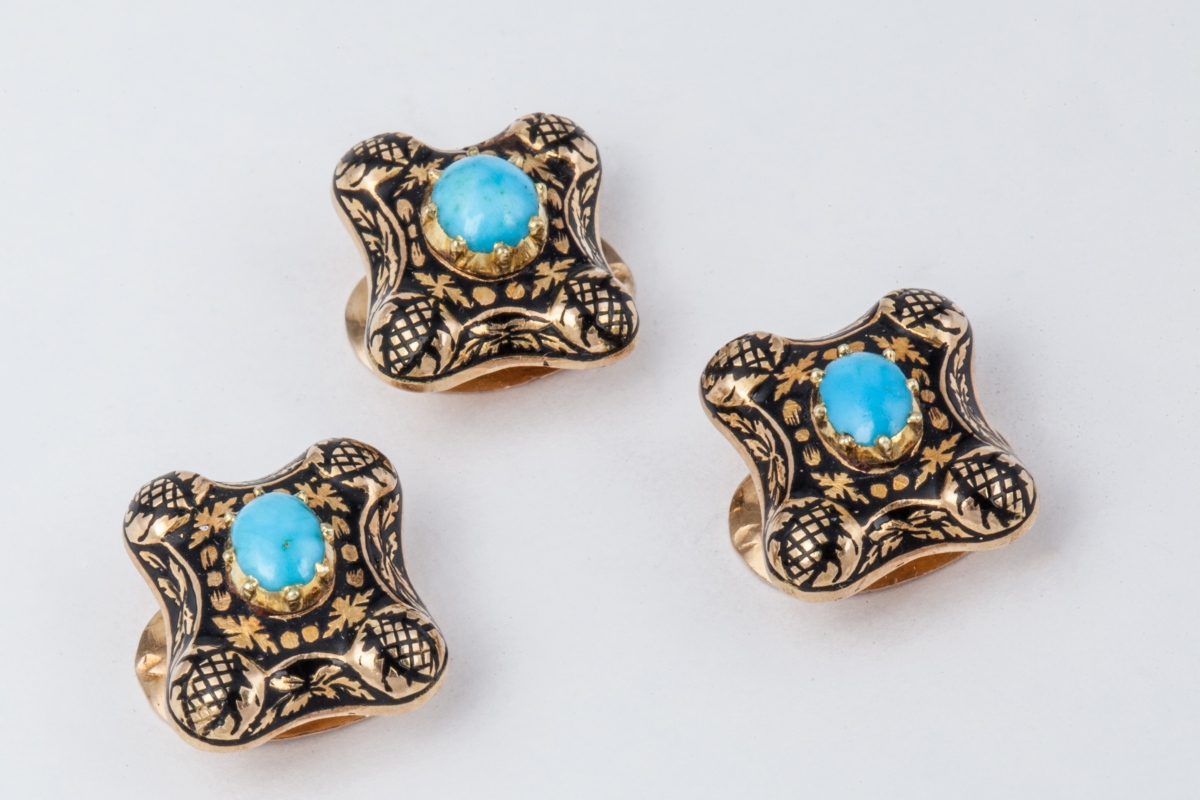 Trois BOUTONS DE COL en or émaillé de motifs feuillagés sur fonds noir et sertis d'une pierre dure de couleur bleu, turquoise (?). Dans un écrin en cuir bouilli.