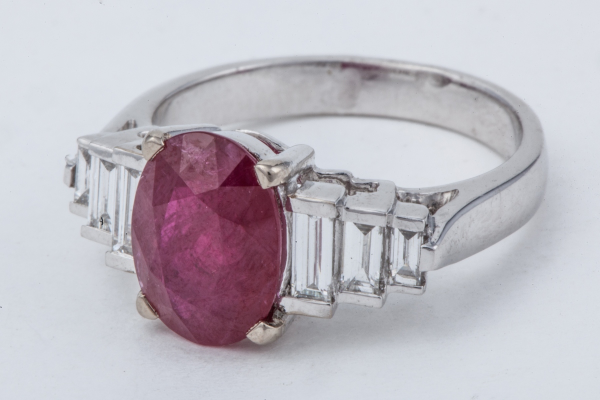 BAGUE en or blanc, ornée d'un RUBIS taille ovale d'environ 3,10 carats, épaulé de 2 X 3 diamants blancs taille baguette en chute d'environ 0,40 carat.
