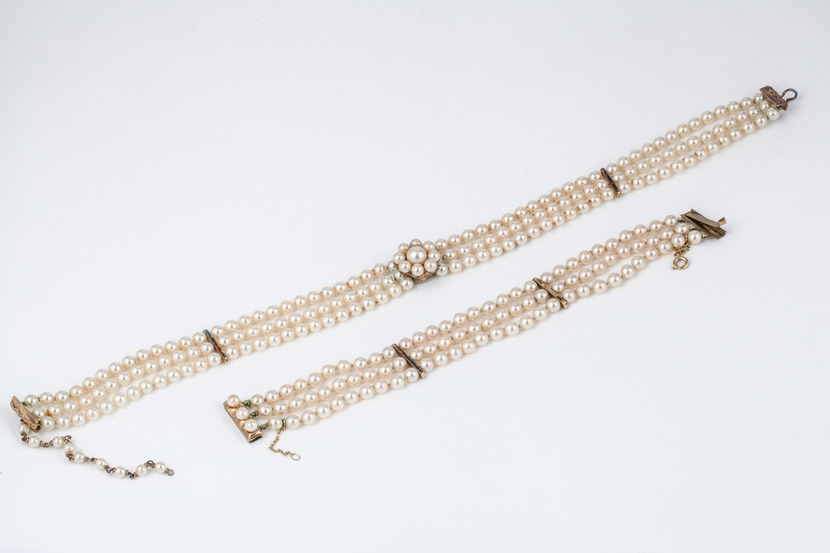 PARURE en or jaune et perle de culture composée d'un COLLIER RAS DU COU à trsoi rangs de perle orné d'une fleur en son centre et d'un bracelet à trois rangs de perles.