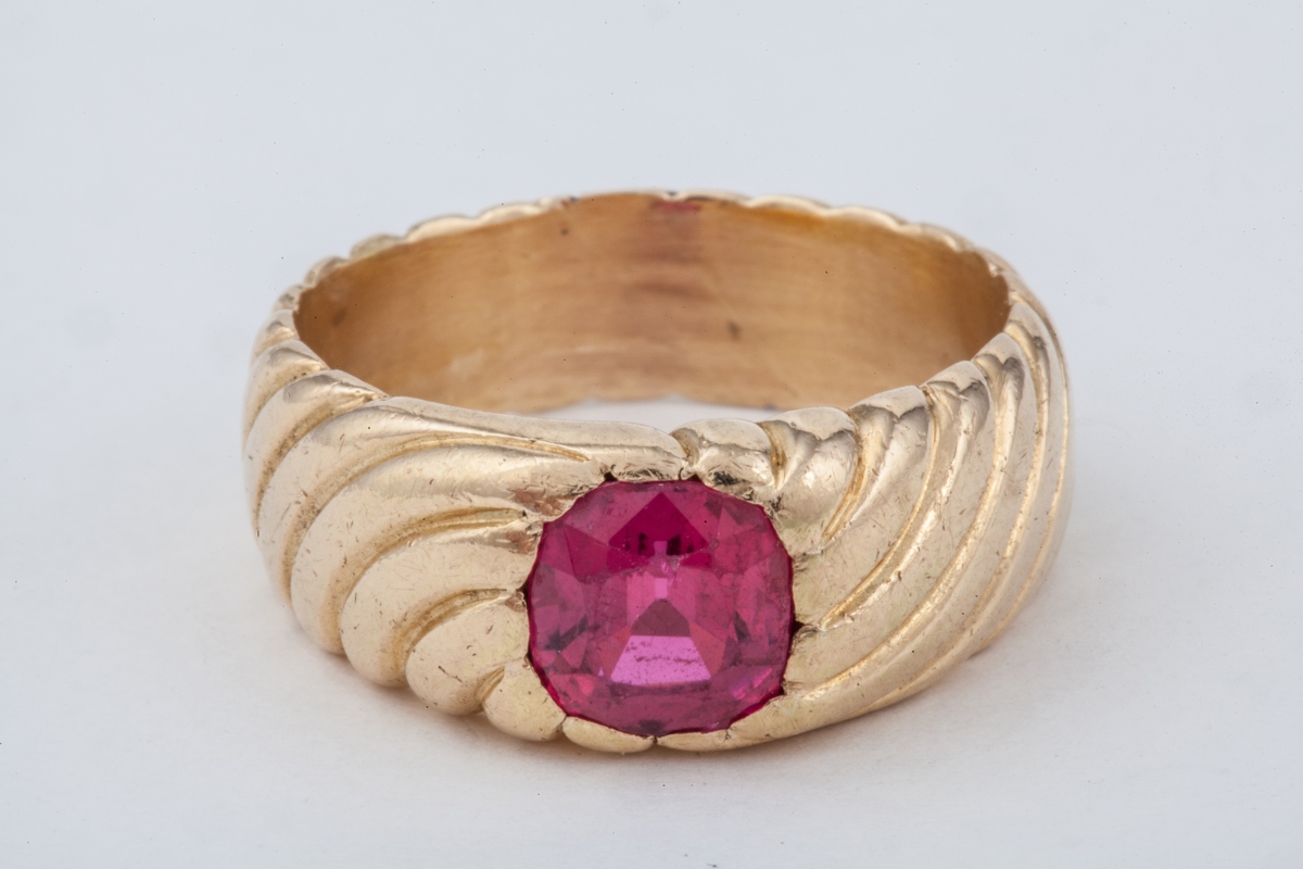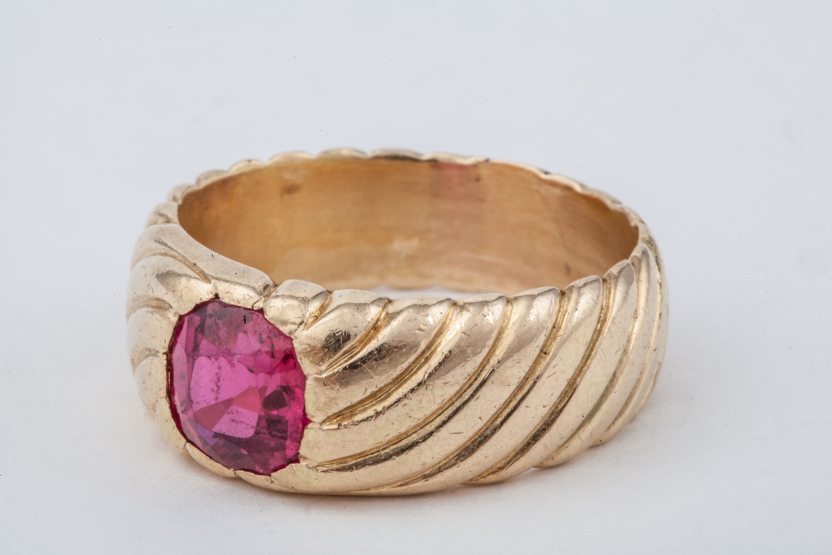 BAGUE en or jaune 18K à décor de cotes torses, le centre orné d'une pierre de synthèse rouge de forme coussin serti clos. (Petit accident près du serti).