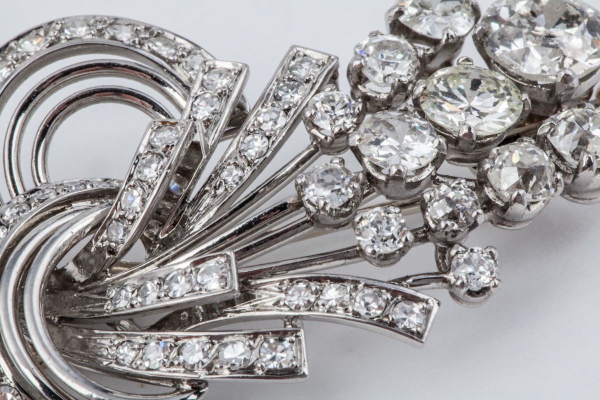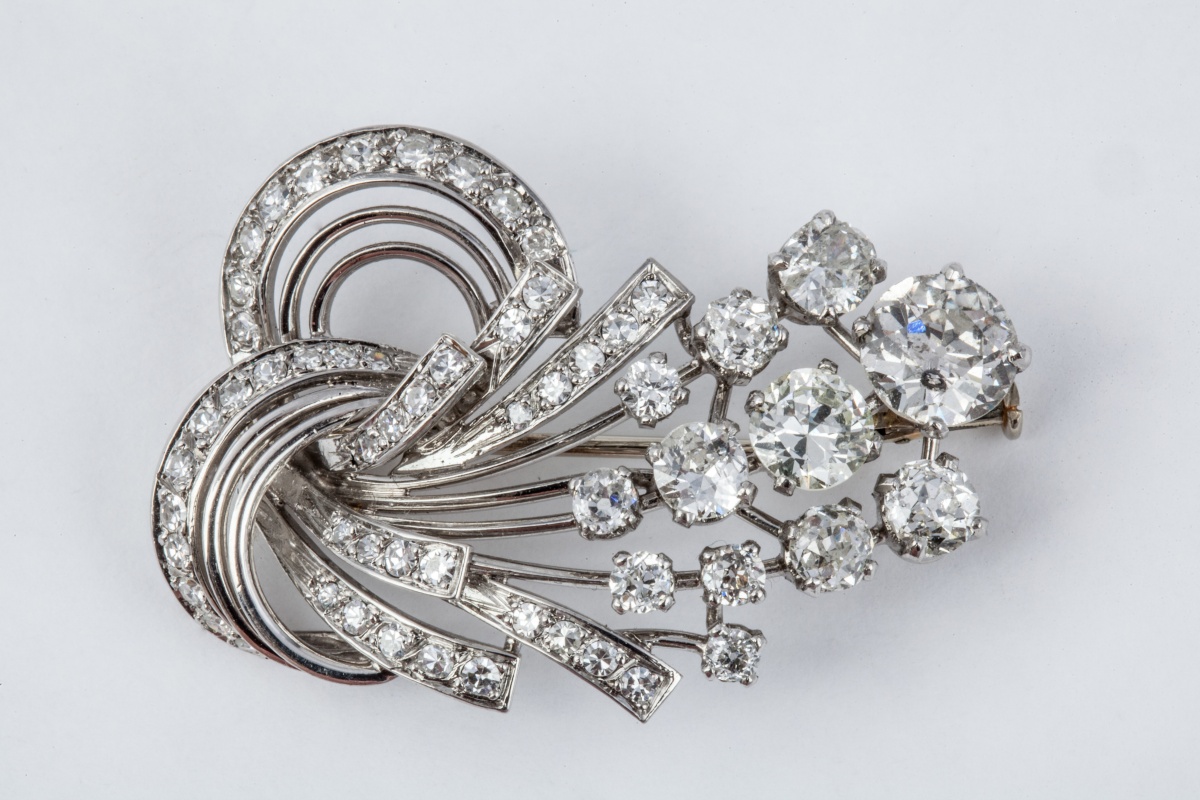 BROCHE "volute" en or gris 18K et platine entièrement sertie de trois lignes de DIAMANTS ronds, trois d'entre elles plus importantes en chute.
