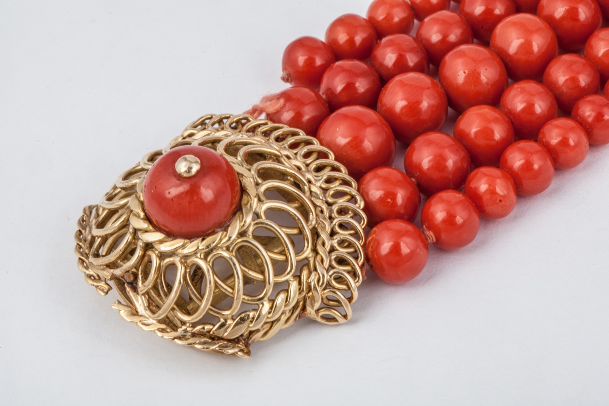 BRACELET en or jaune et corail à cinq rangs de perles de corail, le fermoir en or ajouré.