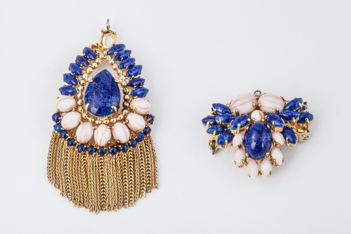BROCHE en métal doré, ornée de pierres d'imitation, retenant en pendentif un motif plus important de même décor.