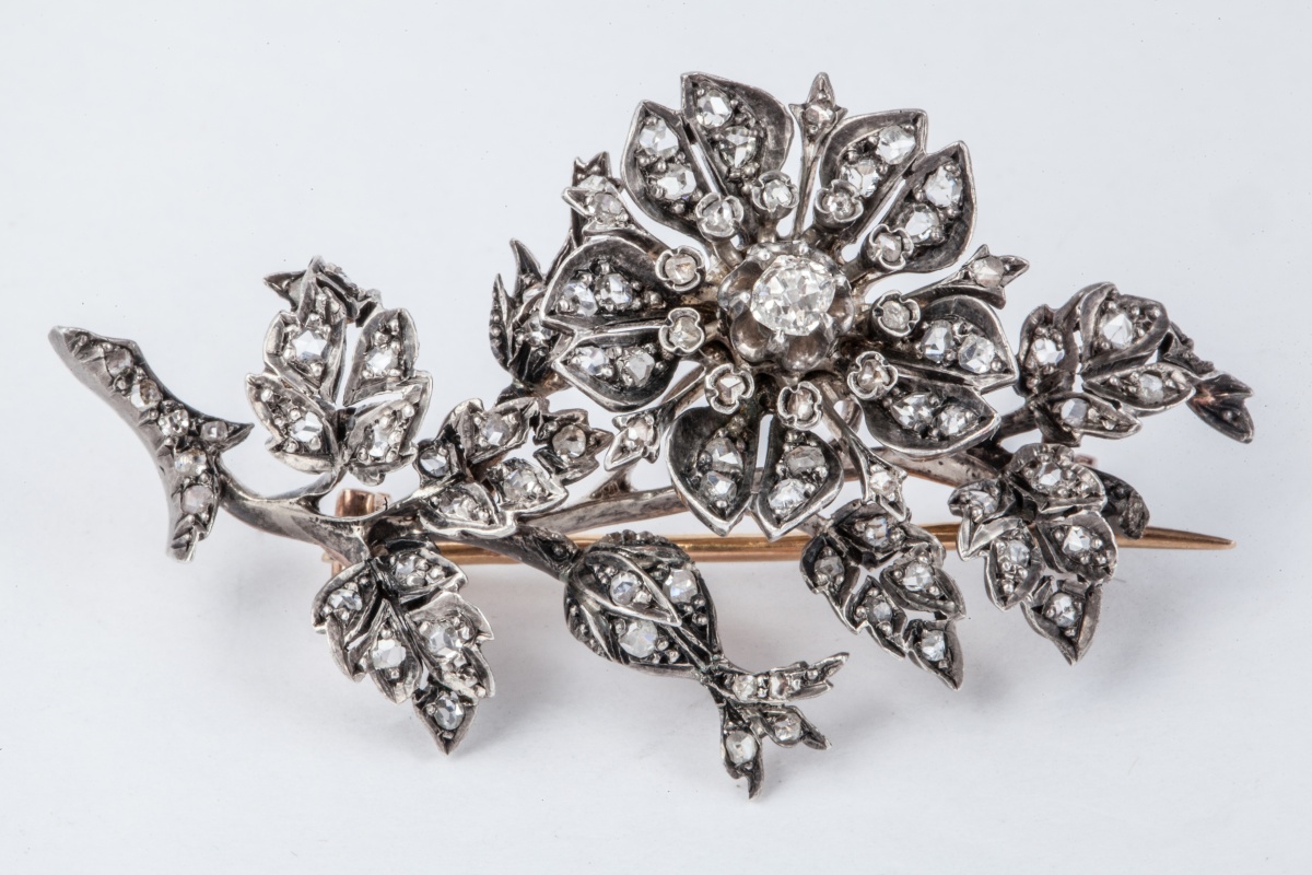 BROCHE FLORALE en or jaune et or blanc ou pltine en forme de fleur pavée de petits DIAMANTS de taille ancienne.