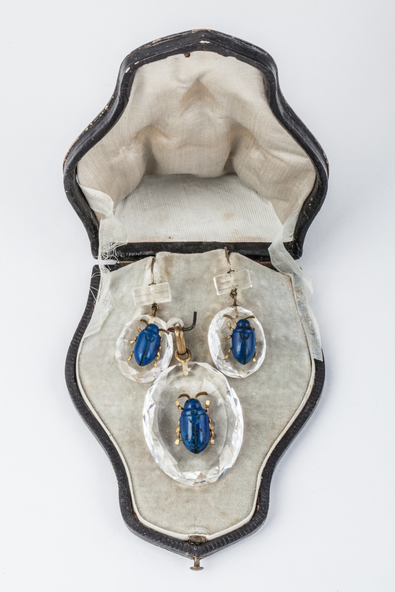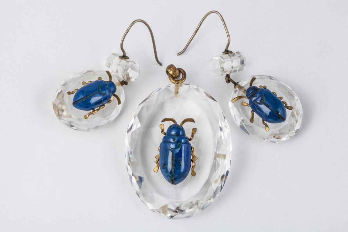 PARURE composée d'un PENDENTIF et d'une paire de BOUCLES D'OREILLES figurant des scarabées en LAPIS LAZULITE sur un CRISTAUX.