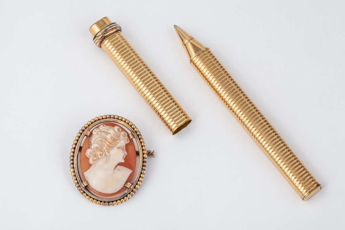 Joint: CAMÉE figurant une jeune femme de profil monté sur une broche en métal doré. Haut. 38 mm.
