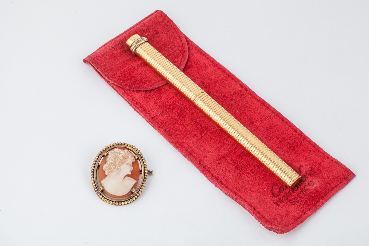 CARTIER. STYLO bille plaqué or, le corps peau de serpent,...
