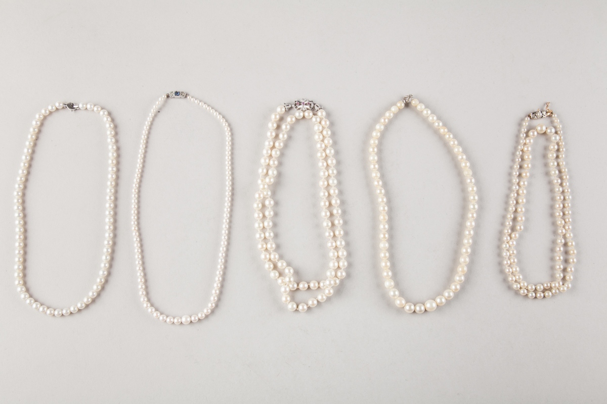 Lot comprenant CINQ COLLIERS de perles de culture chocker ou en légère chute.