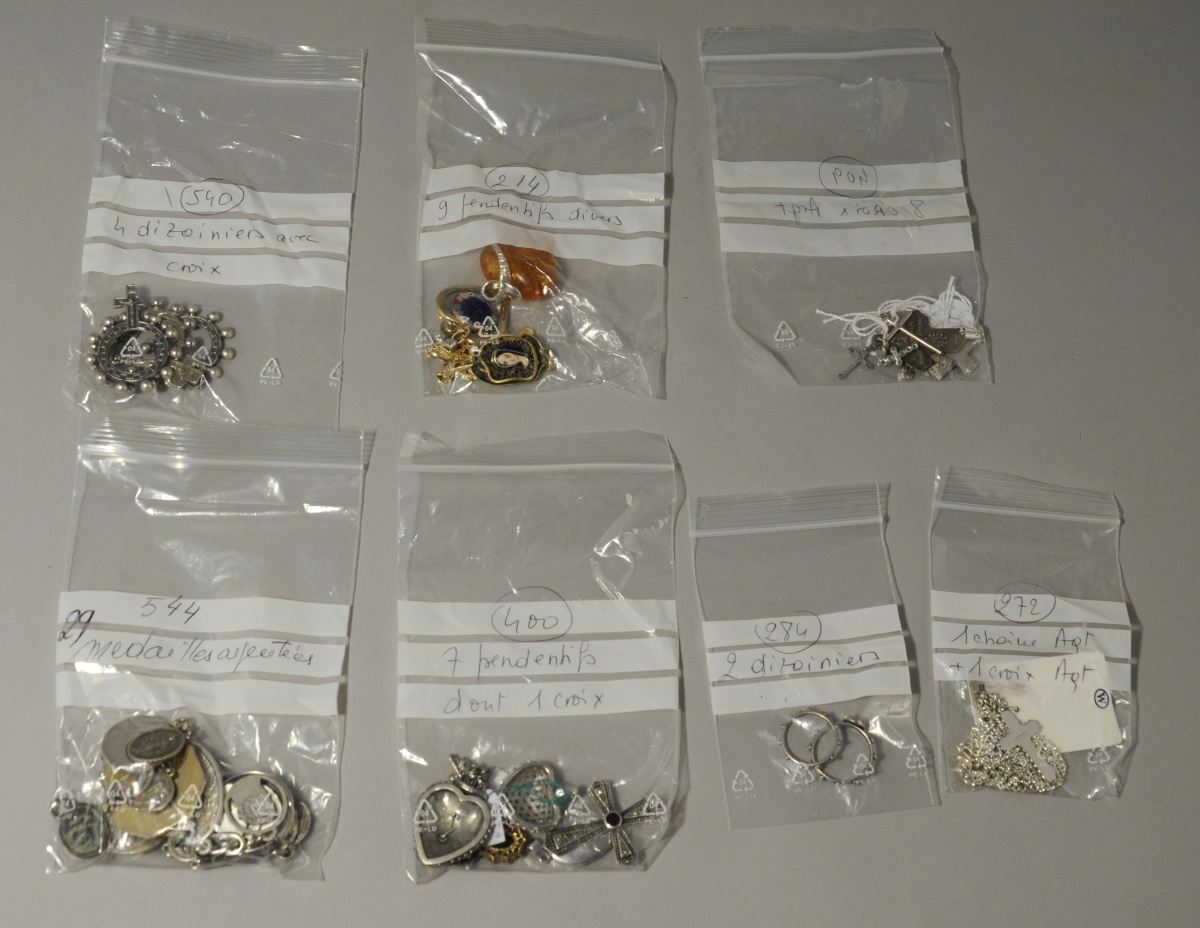 LOT en métal, certaines parties en argent comprenant: MEDAILLES, DIZAINIERS, CROIX et COEURS PENDENTIFS, BAGUES et divers.