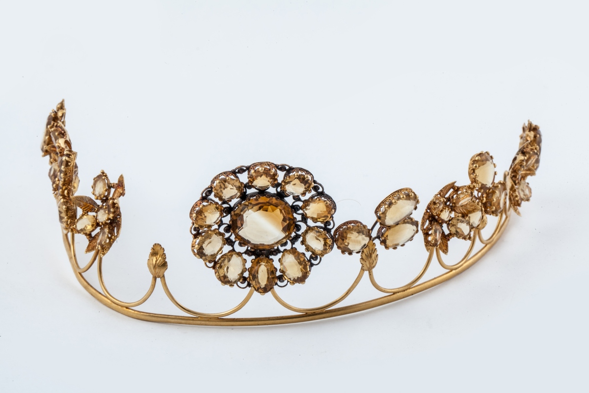 DIADEME en or jaune gravé à décor de fleurs et feuillages serti de citrines.