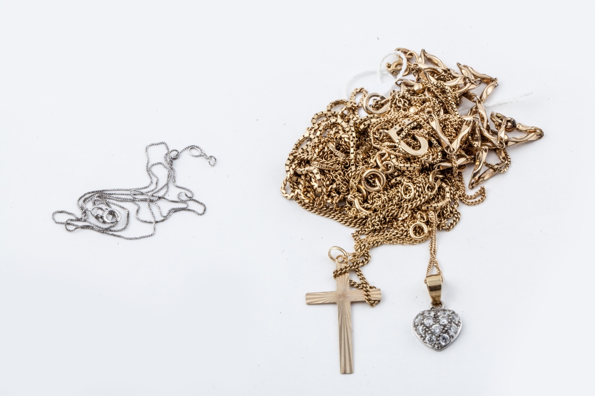 LOT comprenant une CHAINE TOUR DE COU en or gris, SEPT CHAINES en or 750 millièmes (18K), DEUX CHAINES en or 585 millièmes (14K), DEUX CHAINES en or 375 millièmes (9K) et UNE CHAINE en métal, certaines supportant des pendentifs divers (coeur, croix ...)