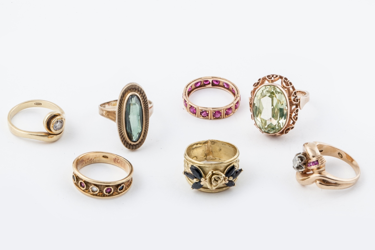 Lot de SEPT BAGUES en or, certaines en or 585 millièmes (14K) ou 375 millièmes (9K), serties de pierres fines et synthétiques.