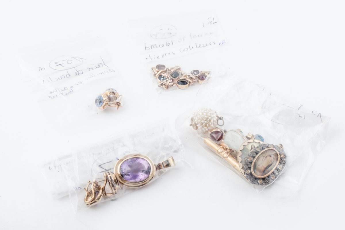 Lot en or et métal, comprenant PENDENTIFS et BOUCLES D'OREILLES, sertis de pierres fines et synthétiques.