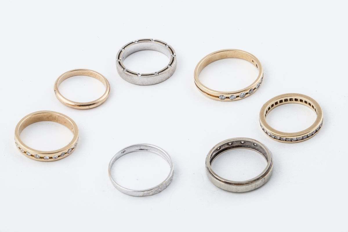 Lot de SEPT ALLIANCES en or, certaines serties de petits diamants, l'une gravée: "co designed by Damiani and Brad Pitt".